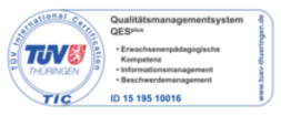 • Um eine gleichbleibende Qualität der Angebote garantieren zu können, hat sich die Volkshochschule 2009 für die Einführung des anerkannten und auf Bildungseinrichtungen zugeschnittenen Qualitätssicherungssystems QES PLUS entschieden. Grundlage unseres Qualitätsverständnisses ist das Leitbild. In den Jahren 2010, 2013 und am 07.06.2016 haben wir die Prüfungen zur Zertifizierung des Qualitätssicherungssystems QES PLUS erfolgreich bestanden. Prüfung und Zertifizierung werden durch den TÜV Thüringen vorgenommen. Dazu finden Überwachungsaudits statt. QES PLUS wird dreijährlich überprüft.