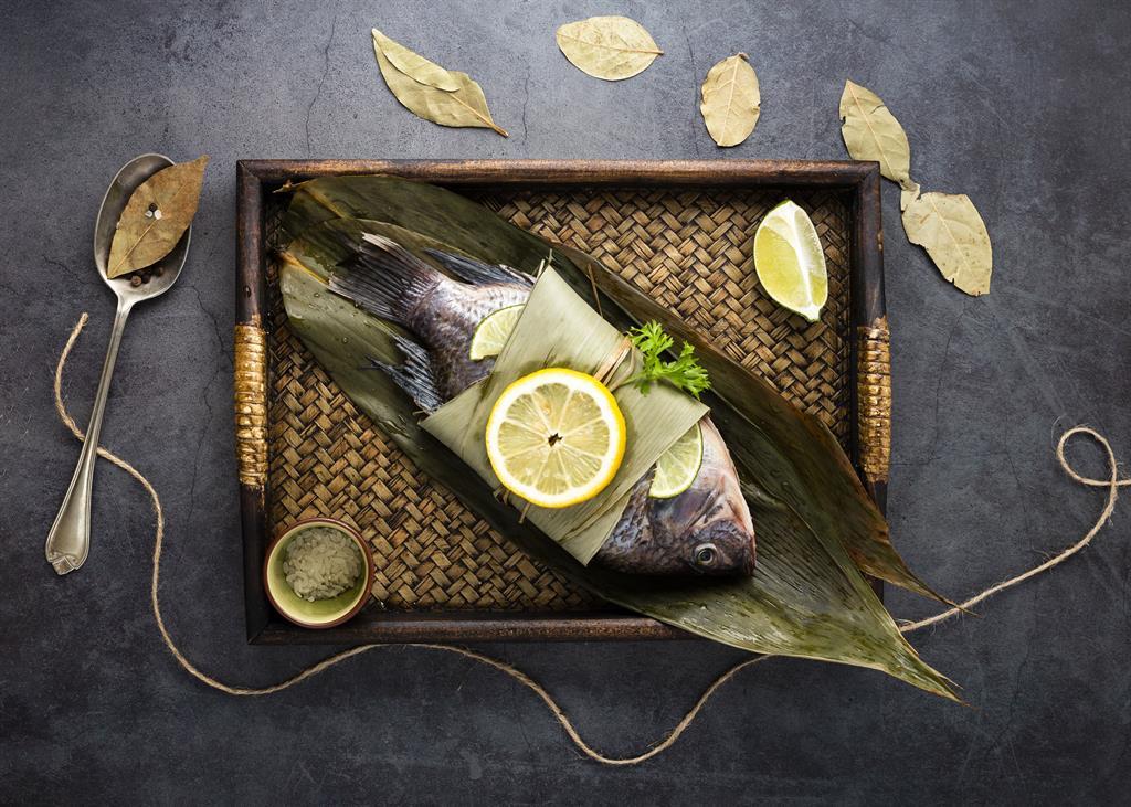 Gegrilltes Forellenfilet auf Zitronenblatt mit Kräuterbutter – sanfte Hitze, zartes Aroma.